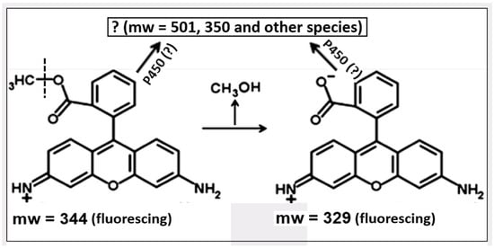 Possible modifications of rhodamine 123. Apart from deesterification of the probe associated with the release of methyl alcohol, several modifications of the initial probe and its product can take place, possibly with involvement of cytochrome P450 (for details, see [175]).
