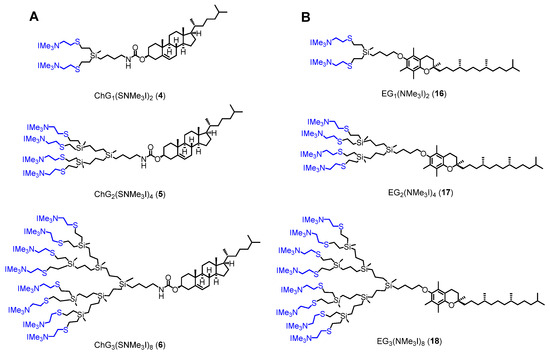 Amphiphilic ammonium-terminated dendrons with cholesterol (4–6; (A)) or d-α-tocopherol (16–18; (B)) at the focal point.