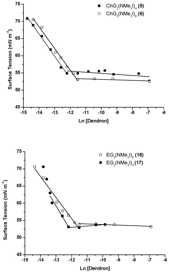 Surface tension measurements of amphiphilic dendrons with cholesterol (top; 5–6) or vitamin E (bottom; 17–18) at the focal point in 40 mM aqueous NaI.