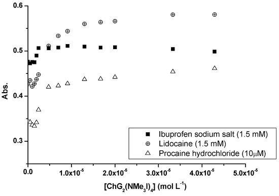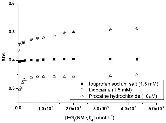 The encapsulation of aqueous-soluble drugs was determined through the modification of their absorbance in the presence of increasing concentrations of dendrons (0.5–50 μM). For all molecules, the absorption spectra showed an increase in the drug absorbance as the dendron concentration increased (see Figure S13). This behavior indicates the association of drug molecules with dendron micelles, although drugs can be incorporated in various ways in micelles: they may locate (i) inside the hydrophobic core of the micelles, (ii) be adsorbed on the surface of micelles, or (iii), in the case of drugs with polar and non-polar regions, they may be in the polar portion between the hydrophilic peripheral groups of dendrons and the non-polar region towards the micelle core. For hydrophilic drugs such as procaine hydrochloride or hydrochlorothiazide, it is well known that a bathochromic shift is observed when transferring from water to a less polar region such as in micelles [35,36]. The absorption maxima were found at wavelengths of 272, 270, and 290 nm for ibuprofen, lidocaine, and procaine, respectively. However, no bathochromic shifts were observed. Although these behaviors suggest that the drugs were adsorbed on the micellar surface, inclusion inside of the micelle cannot be ruled out because these dendritic micelles include rather large amounts of water, disrupting the hydrophobic core [34]. The representation of absorbances at these wavelengths versus dendron concentrations showed absorbance increases for dendron concentrations below the CMC values of the corresponding dendrons (Figure 4) and suggesting that drugs affect the CMC values.