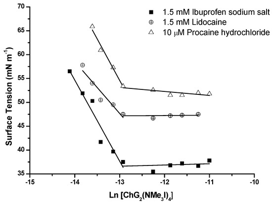 Surface tension measurements of amphiphilic dendrons with cholesterol (top) or vitamin E (bottom) at the focal point in 40 mM aqueous NaI and in the presence of drugs (■ ibuprofen ○ (1.5 mM), lidocaine (1.5 mM), or Δ procaine (10 μM).