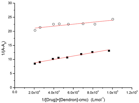 From the data in Figure 4, we can observe that the difference between the absorbance of the drug completely bound to the micelle (plateau A∞) and the absorbance of the drug in water (A0) was the lowest for ibuprofen. All data considered, we can conclude that the binding affinity of ibuprofen to these dendrons is the lowest of all the drugs.