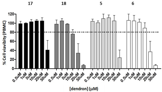 The toxicity of the dendritic systems in eukaryotic cells was also studied. Safe concentrations of the dendrons were determined using MTT assay in peripheral blood mononuclear cells (PBMCs). Acceptable cellular viability was established at 80%, while lower values were considered toxic. The results are shown in Figure 8 where the maximum tolerated concentrations were 20 µM for 5 and 17, and 10 µM for 6 and 18. Considering that the salt concentration in the cellular medium employed is higher than the 40 mM NaI used in the CMC determination, these data reflect different generation-dependent profiles in their toxicity. Toxicity of second-generation amphiphiles 5 and 17 were independent of micelle formation, given that some assayed concentrations higher than the CMC (4.4–4.8 µM) were non-toxic. However, the toxic limit of third-generation dendrons 6 and 18 was established around the CMC values (8.0–9.0 µM) showing toxicity under the micellar regime and suggesting that a possible effect of micelle formation on toxicity could not be ruled out. The cell viability obtained for these dendrons are in the range of those measured for PAMAM-based dendrons or carbosilane dendrons containing fatty acids at the focal points [28,33,41].