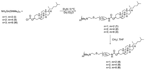 The conjugation of the cholesterol molecule at the focal point using a carbamate linkage was performed by employing a chloroformate derivative of cholesterol (Scheme 1). The reactions with the chloroformate were carried out using primary amine-containing dendrons NH2Gn(SNMe2)m (n = 1, m = 2 (i); n = 2, m = 4 (ii); n = 3, m = 8 (iii)), previously prepared in good yields, following Gabriel and thiol-ene reactions [32]. After a typical extraction workup, the desired cholesterol-modified dendrons ChGn(NMe2)m (n = 1, m = 2 (1); n = 2, m = 4 (2); n = 3, m = 8 (3)) were obtained as colorless oils with good yields (70–80%). The reactions were monitored using 1H-NMR spectroscopy (Figure S1) where signals at 3.13 ppm corresponding to the methylene group attached to the nitrogen atom, confirmed bond formation. In addition, resonances attributed to the cholesterol fragment were observed at 5.34 ppm (-C=CH-) and 4.47 ppm (-CH(O)-). The peak corresponding to the proton in the carbamate N-H appeared at 4.59 ppm but exhibited slight concentration-dependent shifting. In the 13C-NMR spectrum (Figure S2), the resonances ascribed to the same units were observed at 40.6 ppm (-CH2N-), 74.1 ppm (-CH(O)-), and 139.7 and 122.3 ppm (-C=CH-). In addition, the characteristic signal of the carbonyl group was seen at 155.9 ppm.