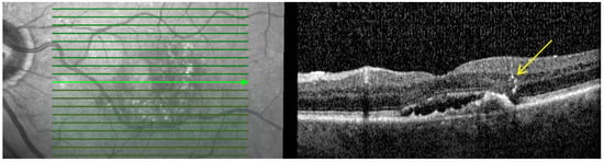 - Macular atrophy (MA): Characterized by in-lesion photoreceptor death and visual impairment and typically follows progressive atrophy and thinning of the retinal pigment epithelium (RPE) and choriocapillaris. The loss of photoreceptors can be detected by the thinning of the Henle fiber layer. This could be detected by OCT by features such as loss of the ellipsoid layer and outer limiting membrane as well as thinning of the outer nuclear layer, which together with the Henle fiber layer and photoreceptors appear as a single hyporeflective band on OCT images as shown in Figure 1 [24,25,26].