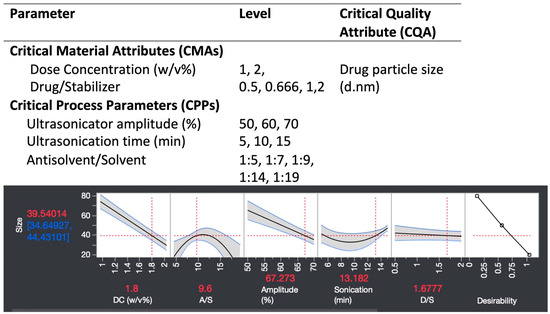 A preliminary screening of the effects of CMAs and CPPs on the particle size. Preliminary experiments explored operative ranges of five factors (table). A response surface analysis on the preliminary results revealed that higher ultrasonicator amplitude and dosing concentration (DC) led to lower particle size. The antisolvent/solvent ratio (A/S) displayed a biphasic effect. An increased drug/stabilizer ratio (D/S) corresponded to a smaller particle size. Therefore, the ratio was further increased beyond the tested range for the DOE. The 70% ultrasonicator amplitude and 10 min processing time were fixed as these settings yielded the smallest particle sizes, chosen for the ease of configuring the analog ultrasonicator and to save experimental time. Three variables, A/S, DC, and D/S were further subjected to a design of experiment.