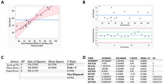 For model diagnostics, the actual by predicted plot demonstrated an R-squared of 0.93 with a p-value of 0.0061, meeting statistical verification criteria (Figure 2A) [51]. The plot has a root mean squared error (RMSE) of 9.158, which is not outside of a normal value as it scales with response data [52]. The model exhibited no lack of fit (Prob > F = 0.5586) and adequately fitted the data, with two degrees of freedom for pure error, four degrees for lack of fit, and six for total error (Figure 2B) [53]. There was no indication of potential outliers, and variance inflation factor (VIF) estimates of less than five confirmed no multicollinearity, indicating that each parameter could be included in the model (Figure 2C,D) [54]. Fulfilling these diagnostic measures indicates that the model sufficiently describes the experimental data using the modeling technique. The model diagnoses reveal no serious deficiencies or deviations. The achieved model is expressed as below: