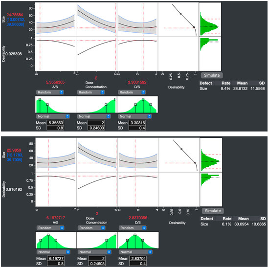 After maximizing the desirability function, the defect rate for the 10–50 nm specification limits decreased from 42.2 to 8.4%, with a predicted size of 24.78684 nm [CI range: 10.00732–39.56636] (Figure 3, top). The factor settings for this first optimization approach were DC of 2% w/v, A/S of 5.4, and D/S of 3.3. The second optimization approach aimed to minimize the defect rate further. A Gaussian process script of the simulation experiment showed factor conditions that lowered the defect rate to 6.1%, with a predicted size of 25.9859 nm [CI range: 12.1783, 39.7935]. The predicted NS particle sizes from the two approaches were very similar.