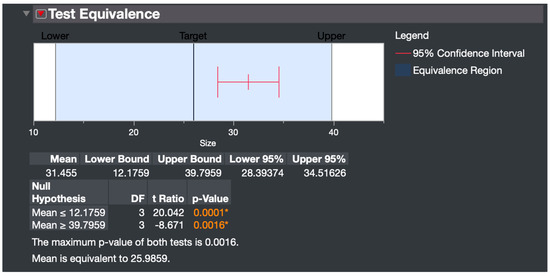 The factor settings from the minimizing defect rate optimization approach were therefore chosen over those of the minimizing particle size approach, as the defect rate was 2.3% lower with a corresponding narrower CI range, with a minor trade-off in predicted size of only 1.19906 nm (Figure 3, bottom). Thus, the factor conditions of the optimized formulation were DC of 2% w/v, A/S of 6.2, and D/S of 2.8. NSs were fabricated using these predicted factor settings, and particle size was measured. The test equivalence distribution analysis showed the mean of four samples prepared at the optimal conditions was equivalent to the predicted size of 25.9859 nm, validating the predictive capability of the model (Figure 4). In equivalence testing, the “Difference Considered Practically Zero” is the threshold below which the true mean is practically equivalent to the hypothesized mean [55]. In this study, the difference was set at 13.8076, calculated as half the confidence interval range around the hypothesized mean of 25.9859 nm at a 95% confidence level.