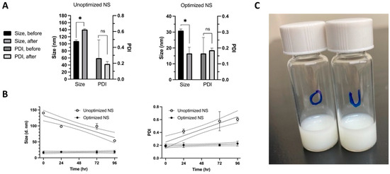 For the optimized NS, the particle size after synthesis of 30.96 nm was reduced to 16.58 nm upon reconstitution (Figure 5A). This reduction in NS particle size after freeze-drying may be attributed to reverse Ostwald ripening. In this process, smaller particles become more stable and form at the expense of larger ones [56]. This phenomenon can be caused by the increased concentration of Vitamin E TPGS in the reduced reconstitution volume, promoting a uniform and dense protective layer around each particle. The optimized NS displayed adequate stability throughout the 96 h time course, with sizes ranging from 16.58 nm to 18.69 nm and PDIs ranging from 0.186 to 0.227, indicating a narrow size distribution with modest changes (Figure 5B) [47]. In contrast, the unoptimized NS was 107.9 nm after synthesis and was reconstituted at 140.5 nm (Figure 5A). The size varied significantly throughout the 96 h time course, ranging from 98.25 nm to 53.71 nm, with PDIs ranging from 0.418 to 0.604, indicating a highly polydisperse sample (Figure 5B). The negative slope for the unoptimized size reflects a decrease in particle size over the 96 h period, while a positive PDI slope reveals an increase in heterogeneity (Table S2). The flat lines (~0 slope) demonstrate that size and PDI remained consistent throughout the study, confirming the optimized NSs were stable. A representative macroscopic image shows that the NS formulations are white and appear similar (Figure 5C).