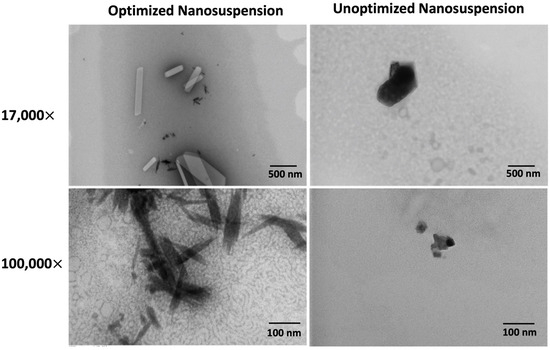 Transmission electron microscopy (TEM) images reveal that the optimized nanosuspension (left) possesses a more crystalline nanocrystal than unoptimized amorphous nanosuspensions (right). TEM images of the optimized and unoptimized nanosuspension formulations at 17,000× (top) and 100,000× (bottom) magnifications. Optimized nanocrystals show size-dependent morphological and color changes, transitioning from dark, slender, shard-like structures at ~30 nm to white, well-defined, dynamically shaded structures in the micron range. Unoptimized nanocrystals predominantly exhibit dark, amorphous, blob-like morphologies, with slight indications of more crystalline structures in larger particles.