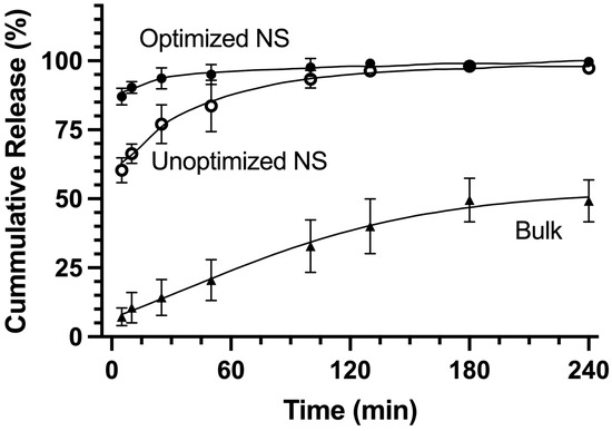 Within the first 5 min, the optimized NS demonstrated approximately 87% cumulative release, compared to 60% for the unoptimized NS and 7% for the bulk powder (Figure 7). The 27% increase in burst release of the optimized NS compared to the unoptimized NS may be attributable to the 3- to 4-fold decrease in particle size. Significant differences in burst release between the NS formulations and the bulk powder are detailed in Table 3. In the optimized NS, the time to achieve 75% drug release (T75) was 1.8 min, considerably shorter than the 20.8 min required in the unoptimized NS, indicating a significantly faster dissolution. At the final 240 min time point, dissolution for the optimized NS reached 100% completion, while the unoptimized NS and bulk powder achieved cumulative releases of 97% and 49%, respectively (Table 3). Burst and total release from both NS formulations were significantly different from the bulk powder, highlighting the role of NS drug delivery in enhancing dissolution rates through reduced particle size.