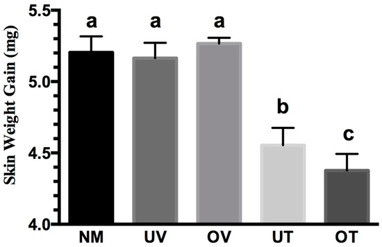 At 24 h after NM administration, the OT group showed a significant reduction in skin weight gain compared to the NM group (4.4 ± 0.1 mg versus 5.2 ± 0.1 mg) (Figure 8). A statistically significant edema reduction effect was also observed in the UT group compared to the NM control group (4.6 ± 0.1 mg versus 5.2 ± 0.1 mg). The OT and UT groups were statically different (4.4 ± 0.1 mg versus 4.6 ± 0.1 mg), highlighting the enhanced in vivo efficacy resulting from the DOE process. The NM, UV, and OV control groups showed no significant differences (5.2 ± 0.1 mg versus 5.2 ± 0.1 mg versus 5.3 ± 0.0 mg). The anti-inflammatory effect observed in the OT and UT groups were therefore attributable to NDH-4338 and not the respective vehicle (4.4 ± 0.1 mg versus 5.3 ± 0.0 mg, 4.6 ± 0.1 mg versus 5.2 ± 0.1 mg, respectively) (Figure 8). Vitamin E TPGS alone did not heal the NM burns in the UV and OV groups at two concentrations (10 mg/mL and 7.14 mg/mL, respectively).