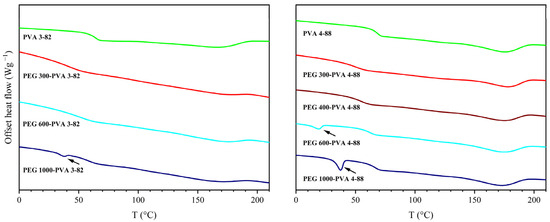 Thermogram of the second heating cycle with PVA 4-88 and PVA 3-82 and different polyethylene glycol (PEG) grades with a ratio of 10 wt% PEG.