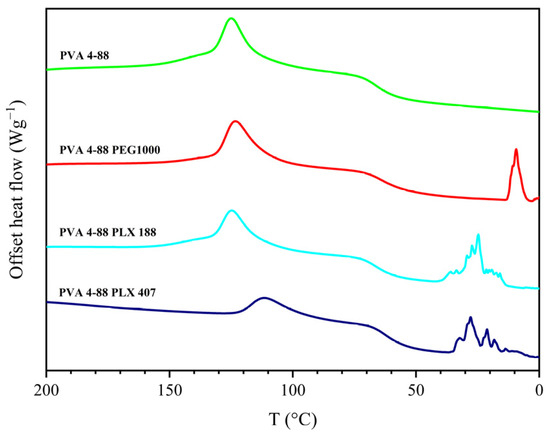 Thermogram of the second heating cycle with PVA 3-82 and PVA 4-88 and 10 wt% poloxamer 407/188 (PLX 407/PLX 188).