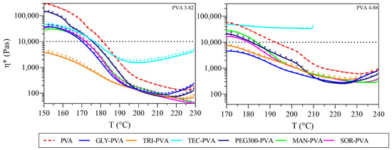 Complex viscosity against temperature, left: PVA 3-82 and PVA 3-82/plasticizer systems; right: PVA 4-88 and PVA 4-88/plasticizer systems, the PVA–plasticizer systems are denoted using abbreviations corresponding to their respective plasticizers: glycerol (GLY), triacetin (TRI), triethyl citrate (TEC) polyethylene glycol (PEG), mannitol (MAN), and sorbitol (SOR), (means of n = 3, + SD), plasticizer proportion is 10 wt%.