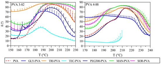 Phase-angle delta against temperature, left: PVA 3-82 and PVA 3-82/plasticizer systems; right: PVA 4-88 and PVA 4-88/plasticizer systems, The PVA–plasticizer systems are denoted using abbreviations corresponding to their respective plasticizers: glycerol (GLY), triacetin (TRI), triethyl citrate (TEC) polyethylene glycol (PEG), mannitol (MAN), and sorbitol (SOR) (means of n = 3, + SD), plasticizer proportion is 10 wt%.