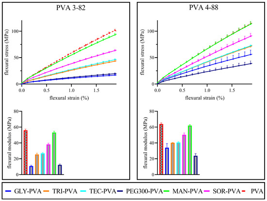 Above: Flexural stress–strain diagram of the respective PVA grades and the PVA–plasticizer systems, mean ± SD, n = 10; Below: Flexural modulus of the respective PVA and the PVA–plasticizer systems, The PVA–plasticizer systems are denoted using abbreviations corresponding to their respective plasticizers: glycerol (GLY), triacetin (TRI), triethyl citrate (TEC) polyethylene glycol (PEG), mannitol (MAN), and sorbitol (SOR), mean ± SD, n = 10, plasticizer proportion is 10 wt%.