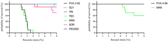 While both PVAs showed similar flexibility, there were significant differences in the brittleness of the polymers. This is illustrated by a variation in the Kaplan–Meier plot, as can be seen in Figure 10. While no strand of the PVA 4-88 filaments broke during the entire test, 50% of the PVA 3-82 filaments broke after only 3% strain and all strands broke after 3.5% strain. The influence of plasticizers on the mechanical properties showed differences between the PVA grades. The mannitol formulation exhibited brittleness very similar to that of pure PVA 3-82. Sorbitol showed some improvement in flexibility, but 30% of the filaments broke. Following these, triacetin and triethyl citrate formulations each resulted in a 10% breakage loss during the test. PEG 300 and glycerol were the best-performing formulations, reducing the brittleness the most with no breakage during the test. The evaluation of brittleness was more difficult with PVA 4-88, since no filament broke even with the neat polymer (Figure 9). The plasticizer systems showed the same behavior. No filament broke in the three-point bending test. An exception were the filaments with the combination of mannitol and PVA 4-88; here, an embrittlement of the polymer could be observed. Thus, the first breaks already occurred at a deflection of the filament by approximately 4.5% flexural strain. Across the entire measurement range, 30% of these filaments broke.