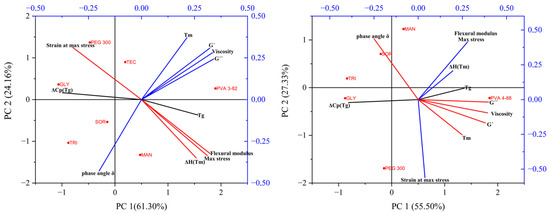 PCA biplot (PC1 vs. PC2) (left): for PVA 3-82 and PVA 3-82/plasticizers systems, (right): for PVA 4-88 and PVA 4-88/plasticizers systems, the PVA–plasticizer systems are denoted using abbreviations corresponding to their respective plasticizers: glycerol (GLY), triacetin (TRI), triethyl citrate (TEC) polyethylene glycol (PEG), mannitol (MAN), and sorbitol (SOR).
