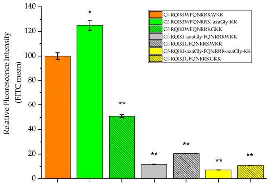 Based on these findings, we planned to synthesize a set of penetratin derivatives to investigate the effect of the Trp substitution by aza-glycine and glycine at position 48 or 56 or both on the cellular uptake. These peptides were synthesized manually on a Rink-amide MBHA resin using solid-phase peptide synthesis by Fmoc/tBu strategy. All the natural amino acids were coupled using DIC and Oxyma pure as coupling reagents. The N-terminus of the peptides were labelled by 5(6)-carboxyfluorescein and the same reagents on the solid phase. The aza-Gly residue was inserted into the sequence using three equivalents of Fmoc-NH-NH2 and three equivalents of 1,1-carbonyldiimidazole (CDI) in the presence of DIEA as a base []. The success of the coupling reactions was examined by the ninhydrin test. The coupling of the amino acid to the aza-Gly cannot be detected by the ninhydrin test, therefore, we performed its coupling twice. The peptides were cleaved from the resin using a cleavage mixture. The crude peptides were purified by RP-HPLC and characterized by analytical RP-HPLC and ESI-MS (Table 1; the analytical RP-HPLC chromatograms and MS spectra are in the Supplementary Materials, Figures S1–S14.