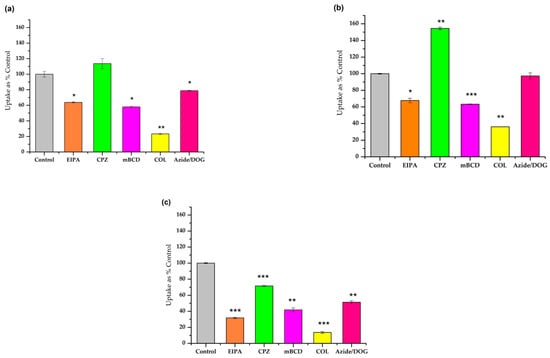 Effect of endocytosis inhibitors on the internalization of peptides (a) Pen(desMet), (b) Trp56aGlyPen(des), and (c) Trp56GlyPen(des). A-431 cells were pretreated with the EIPA (500 µM), CPZ (300 µM), mBCD (36 mM), COL (200 mM), NaN3 (500 µM), and DOG (250 mM) for 30 min, followed by treatment with peptides (5 µM) for 90 min. Any significant difference from the control was determined by Student’s t-test (* p < 0.05). Data represent the mean ± standard deviation (SD).The asterisks show a significant difference between the control Pen(desMet) and its derivatives (* p < 0.05, ** p < 0.01, *** p < 0.001).