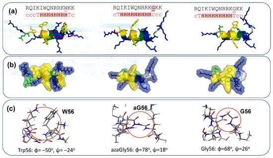Structural properties of the most promising peptides, Pen(desMet) (left), Trp56aGlyPen(des) (middle), and Trp56GlyPen(des) (right). (a) Primary structure of peptides. The unlined G (with red color) represents azaGly residue. The 2-dimensional secondary structure of ωB97XD-optimized structures for the model peptides is analyzed through the DSSP website (c represents coil, T turns, and H is helical structure). (b) Surface model of the predicted. The color code for the amino acid residue: hydrophobic residue—yellow; polar residue—green; hydrophilic residue—blue. (c) The dihedral angle of amino acid residue at position 56 of the model peptides. Red circle represents the amino acid residue, W56, azaGly56, or Gly56.The coordinates of three optimized peptide structures are found in the Supporting Materials Table S1.