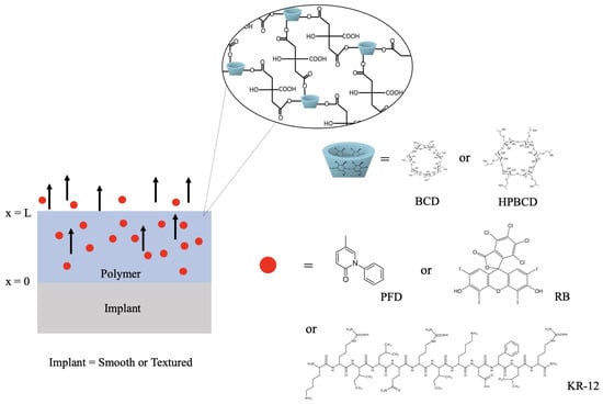 Interestingly, for both smooth and textured implants, the release of 50% of the drugs (PFD, RB, and KR-12) occurred faster in BCD coatings compared to HPBCD coatings. This trend is observed in the intersection of drug release profile simulations and diffusion profile simulations. For instance, in the case of PFD release from smooth implants, the BCD-coated sample reached 50% release around 4 h, whereas the HPBCD-coated sample reached it at 12 h. This difference can be attributed to the higher degree of polymerization exhibited by the HPBCD molecule compared to native BCD [30]. The hydroxypropyl groups of HPBCD enhance the reactivity of the –OH groups present in cyclodextrin, facilitating esterification reactions with the cross-linking agent. This results in a denser three-dimensional polymer matrix, which releases the drugs at a slower rate.