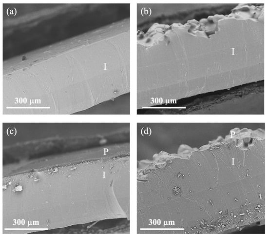 Cross-sectional view of SEM images: (a) smooth implant, (b) textured implant, (c) smooth implant polymerized with HPBCD, and (d) textured implant polymerized with HPBCD. P = polymer and I = implant.