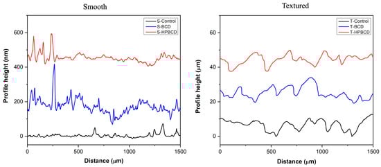 On the other hand, the profile height of the samples has been plotted to better visualize their topography (Figure 3). The valleys and peaks of smooth sample surfaces are in the range of nanometers, while textured samples are in the range of micrometers. Accordingly, the roughness of the smooth surface samples increased from 60 ± 40 nm (control) to 350 ± 50 nm and 300 ± 40 nm for the samples coated with BCD and HPBCD polymers, respectively. For the textured samples, the roughness increased from 12.5 ± 5 μm (control) to 25 ± 10 μm and 20 ± 10 μm for the samples polymerized with BCD and HPBCD, respectively.