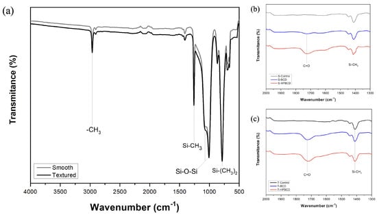 FTIR spectra of samples: (a) smooth and textured controls, (b) smooth implants coated with BCD and HPBCD polymers, and (c) textured implants coated with BCD and HPBCD polymers.
