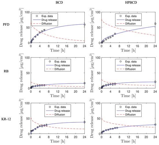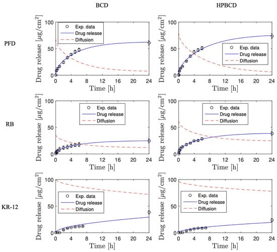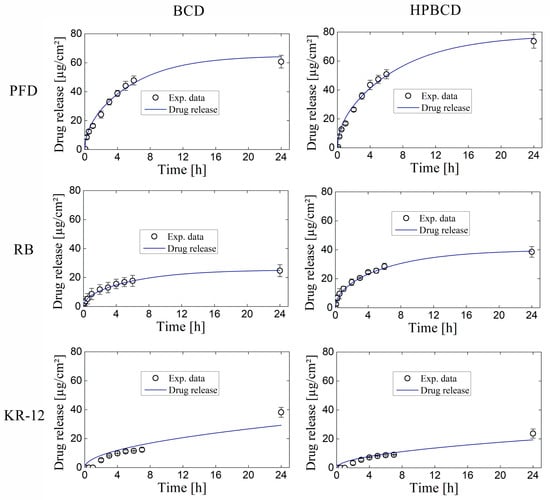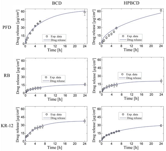 The simulation of release profiles for PFD, RB, and KR-12 molecules from polymerized samples with BCD and HPBCD is presented in Figure 5 for smooth implants and Figure 6 for textured implants. Drug release profiles were simulated using experimental data and were well adjusted with the mathematical model. Additionally, the diffusion profiles of drugs through the cyclodextrin polymers are also depicted in the same figures. These simulations were derived directly from the mathematical model due to the absence of experimental data for this particular phenomenon. These results are of significant value, considering that conducting an experimental methodology to obtain diffusion profiles in thin films, especially for micron-level thickness, can be notably costly.
