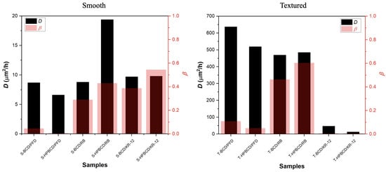 The calculated values of D and for both types of implants, smooth and textured, are graphically represented in Figure 7. In the case of smooth samples, the diffusivity values ranged from 6.6 to 19.4 μm2/h, and no discernible correlation with the molecular weight of the drugs was observed. Conversely, for textured samples, the D values displayed a broader range from 13 to 637 μm2/h, exhibiting an inverse relationship with the molecular weight of the drugs, as previously reported by A. Bogdan et al. (2011) [31]. Specifically, lower molecular weight drugs demonstrated higher diffusivity, while higher molecular weight drugs exhibited lower diffusivity. The difference in diffusivity can be attributed to the characteristics of the implants. For smooth implants, the thin coating on the upper substrate surface allowed for the rapid adsorption of the PBS solution, facilitating unrestricted drug movement and diffusion [32,33,34]. Conversely, the textured samples, with their thick and irregular polymer coating, adsorbed the PBS solution at a slower rate, thus favoring mass diffusion, in accordance with the molecular weight of the released drugs.