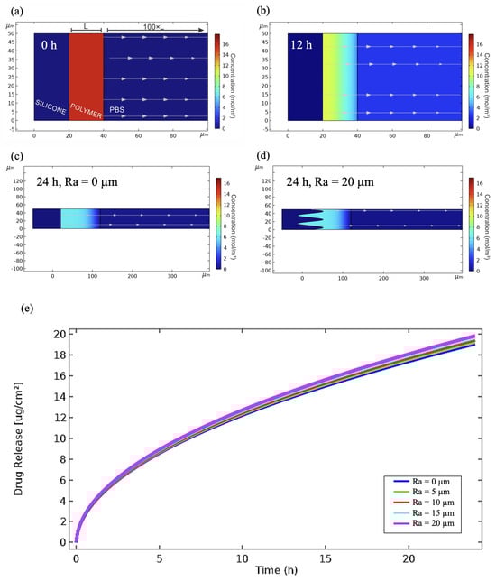 In order to validate the mathematical model, COMSOL Multiphysics simulations were performed using the previously obtained kinetic parameters D and . Figure 8 shows the two-dimensional COMSOL Multiphysics design used for simulations. As a representative example, Figure 8a presents the case of S-HPBCD/KR-12 at time 0 h and Figure 8b at 12 h of release. The evolution of the drug delivery is observed in the increase in concentration drug in PBS medium and its decrease in the polymer matrix. Moreover, due to the versatility of COMSOL Multiphysics in terms of geometry design, the roughness of the textured samples was modified from an arithmetic average roughness (Ra) of 0 μm to 20 μm (Figure 8c and Figure 8d, respectively), but maintaining the polymer coating as a thin film, similar to that of the smooth samples, just as was considered in the mathematical model. Results show that this assumption was correct because profiles were similar for different cases of Ra with no strong impact on the release profiles of drug (Figure 8e). These values of roughness are in the range reported for this type of textured implants [36].