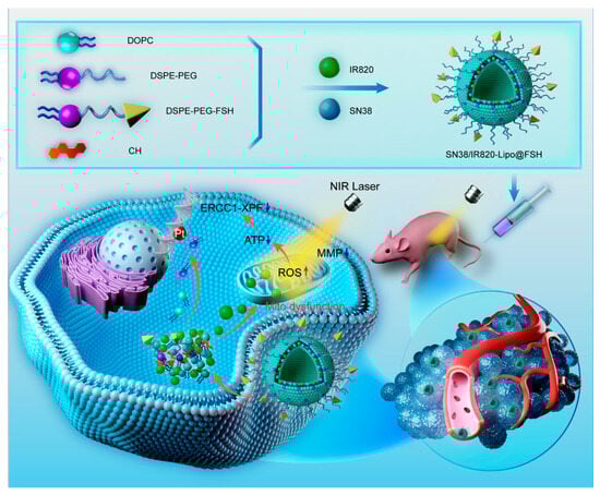 SN38 was procured from Dalian Meilun Biotechnology Co., Ltd. (Dalian, China). The FSH β (FSH) peptide (YTRDLVYKDPARPKIQKTCTF) was custom-synthesized by Nanjing TGpeptide Biotechnology Co., Ltd. (Nanjing, China). New indocyanine green (IR820) and Coumarin-6 (98%) were obtained from J&K Scientific Co., Ltd. (Beijing, China). DSPE-PEG2000, DSPE-PEG2000-Mal, 2-dioleoyl-sn-glycero-3-phosphocholine (DOPC), and cholesterol were purchased from AVT (Shanghai, China) Pharmaceutical Technology Co., Ltd. (Shanghai, China). The Cell Counting Kit-8 (CCK-8) was obtained from Dojindo Laboratories (Kumamoto, Japan). The Fluorescein Isothiocyanate (FITC)-Annexin V/Propidium Iodide (PI) apoptosis detection kit was acquired from Beyotime Biotechnology Co., Ltd. (Shanghai, China). The ROS Detection Kit was purchased from Enzo Life Sciences Co., Ltd. (Beijing, China). The Calcineurin-AM/PI Staining Kit and 4′,6-diamidino-2-phenylindole (DAPI) were purchased from Solarbio Life Sciences Co., Ltd. (Beijing, China). The 1,1-dioctadecyltetramethyl indotricarbocyanine iodide (DIR) was obtained from Biotium Inc. (Hayward, CA, USA). Chloroform and methanol (HPLC grade) were purchased from Sigma-Aldrich Co. (St Louis, MO, USA). Fetal bovine serum (FBS) was purchased from GIBCO LLC. (Grand Island, NY, USA). RPMI 1640 medium, DMEM medium, and phosphate-buffered saline (PBS) were obtained from Thermo Fisher Scientific Co., Ltd. (Beijing, China).