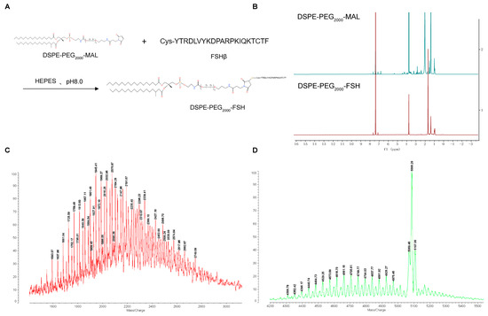 (A) Synthesis route of DSPE-PEG2000-FSH; (B) 1H NMR spectra of DSPE-PEG2000-Mal and DSPE-PEG2000-FSH; (C,D) MALDI-TOF-MS spectra of DSPE-PEG2000-FSH.