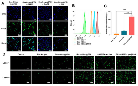 Cou-6-Lipo and Cou-6-Lipo@FSH were prepared to track liposome uptake in A2780, HepG2, and C26 cells. The uptake and efficiency of SN38/IR820-Lipo@FSH were determined using flow cytometry and confocal microscopy. As shown in Figure 4A, the green fluorescence signal of Cou-6 increased in A2780 cells after incubation with Cou-6-Lipo@FSH for 4 h. In contrast, the fluorescent signal increased only slightly in HepG2 and C26 cells after treatment with Cou-6-Lipo@FSH. Furthermore, the uptake of liposomes with the FSH peptide was significantly higher than the uptake of liposomes without the FSH peptide in A2780 cells. These results indicate that the FSH peptide can accurately target the FSHR receptor in A2780 cells to enhance specificity. The results obtained from flow cytometry were consistent with the confocal microscopy results. As shown in Figure 4B,C, the uptake of Cou-6-Lipo@FSH was 4.04 times higher than the uptake of Cou-6-Lipo in A2780 cells. These results indicate that liposomes with the FSH peptide enhance uptake, selectivity, and efficiency in tumor cells with high FSHR expression.