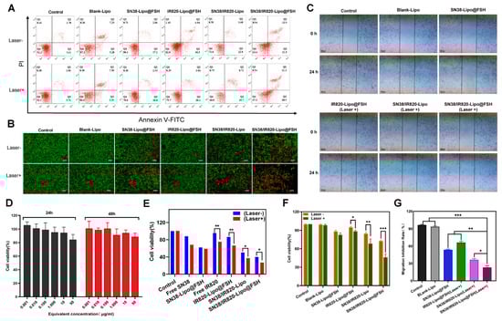 (A,F) The flow cytometry results of A2780 cell apoptosis and the percentage of early and late apoptosis after the 48 h treatment and near-infrared laser irradiation with Control, Blank-Lipo, SN38-Lipo@FSH, IR820-Lipo@FSH, SN38/IR820-Lipo and SN38/IR820-Lipo@FSH; (B) Live/dead detection was performed on A2780 cells treated with different liposomes using the Calcein AM/PI dual staining (Scale bar: 200 μm); (C,G) Wound healing Assay; (D) In vitro cytotoxicity of Blank-Lipo on A2780 cells; (E) Inhibitory capacity of different formulations against A2780 cells proliferation. Data are shown as mean ± SD (n = 3). * p < 0.05, ** p < 0.01, *** p < 0.001.