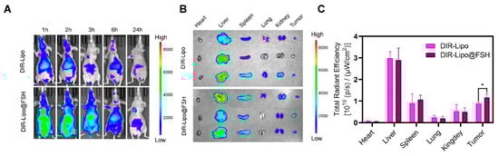 Biodistribution of SN38/IR820-Lipo@FSH in vivo. (A) Fluorescence images captured in vivo depict A2780-bearing BALB/c Nude mice treated with DIR-Lipo and DiR-Lipo@FSH. Images were taken at 1, 2, 3, 6, and 24 h after injection; (B) Fluorescence images of the excised tumors and major organs were obtained at 24 h after injection; (C) Quantitative Region of Interest (ROI) analysis was performed on the excised tumors and major organs at 24 h after injection. Data are shown as mean ± SD (n = 3). * p < 0.05.