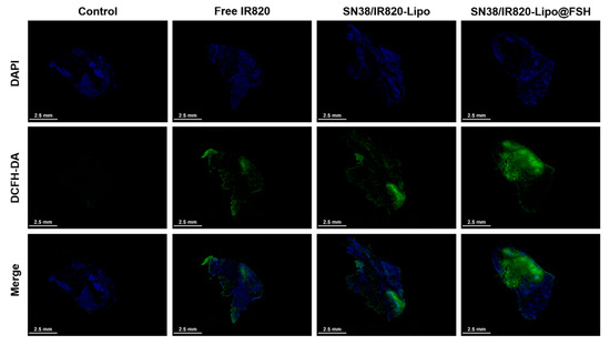 To evaluate US-induced ROS generation at the tumor sites, the tumor-bearing BALB/c nude mice (n = 3/group) were intravenously injected with PBS, Free IR820, SN38/IR820-Lipo, and SN38/IR820-Lipo@FSH (IR820 dose of 10 mg/kg). After 24 h, the mice were anesthetized with chloralic hydras and injected with 50 µg DCFH-DA intra-tumorally. After 10 min, the tumor sites of the mice were irradiated (808 nm, 0.5 W/cm2) for 10 min and then, the mice were sacrificed. The collected tumors were flash frozen and observed by CLSM.