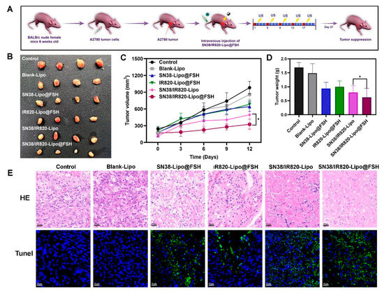 Anti-tumor Evaluation of SN38/IR820-Lipo@FSH in vivo. The A2780-bearing BALB/c Nude mice were treated with Saline, Blank-Lipo, SN38-Lipo@FSH, IR820-Lipo@FSH, SN38/IR820-Lipo and SN38/IR820-Lipo@FSH. (A) Experimental procedure; (B) Image of isolated tumor tissues of mice; (C) Tumor volume of mice; (D) Weight of isolated tumors; (E) H&E and TUNEL assay of tumor tissues isolated from mice (Scale bar: 50 μm). Data are shown as mean ± SD (n = 4). * p < 0.05.