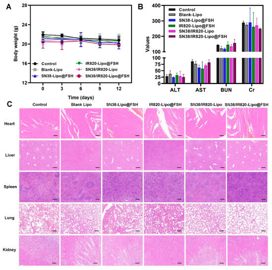 Weight loss reflects cancer proliferation and systemic drug toxicity, and preventing weight loss is essential for cancer survival [21]. Changes in mouse body weight after treatment with the various formulations are shown in Figure 9A. Significant changes in body weight did not occur in any treatment group, suggesting that the liposomes reduced the toxicity and side effects of the drugs and were, therefore, safe in mice. Hematological analysis of blood samples from mice treated with the different formulations showed that serum alanine aminotransferase, aspartate aminotransferase, creatinine, and blood urea nitrogen were stable, and all the parameters fell within the safe range for each group (Figure 9B). These findings imply that SN38/IR820-Lipo@FSH may lower SN38 toxicity and improve chemotherapy drug safety, making it a valuable potential delivery strategy.