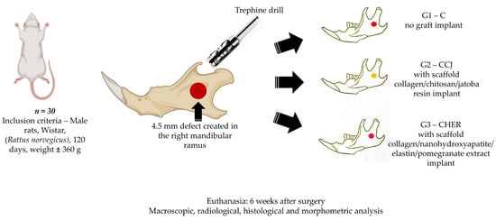 Experimental design. Inclusion criteria: Male Wistar rats (Rattus norvegicus) weighing approximately 360 g and 120 days old. Bone defect of 4.5 mm in the right ramus of the mandible. According to the filling of the bone defect, the animals were divided into three groups: group 1 (Control-C), n = 10, defect without graft, only clot; group 2 (CCJ), n = 10, defect filled with scaffold collagen/chitosan/jatoba resin; group 3 (CHER), n = 10, defect filled with scaffold collagen/nanohydroxyapatite/elastin/pomegranate extract. After 6 weeks of the experimental period, the animals were euthanized and samples from the surgical areas were submitted to macroscopic, radiological, histological, and morphometric analysis.