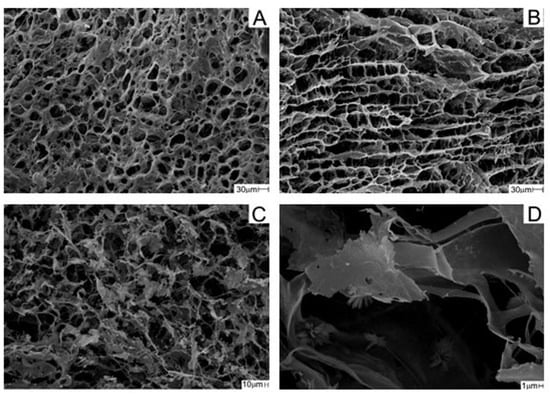 SEM micrographs of the scaffolds: (A) superficial CCJ, (B) transversal section CCJ, and (C) superficial CHER, all with 500x magnification, and (D) superficial CHER 6000× magnification.