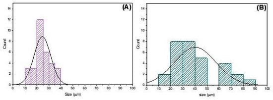Pore size distribution histogram for scaffolds (A) CCJ and (B) CHER.