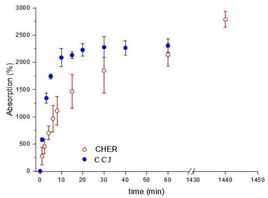 The degree of absorption of the matrices is shown in Figure 6. CCJ had a maximum absorption of 2300% at 60 min, while CHER had a maximum absorption of 3400% at 1440 min. Observing the behavior of both scaffolds at 30 min, an absorption of 2277 ± 192% for CCJ and 1849 ± 414% for CHER was obtained; that is, the absorption for the CHER matrix was greater but its swelling was slower than for CCJ.