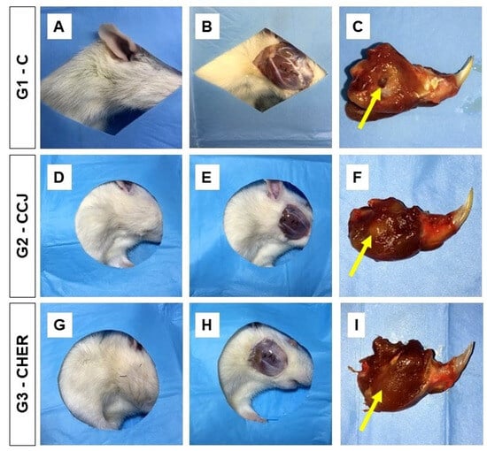 Macroscopic characteristics of the bone lesion in the ramus of the mandibles of rats in groups G1 (A–C), G2 (D–F), and G3 (G–I). There were no changes suggestive of infection in the surgical area. It was possible to see the membrane (yellow arrows) in some samples (F).