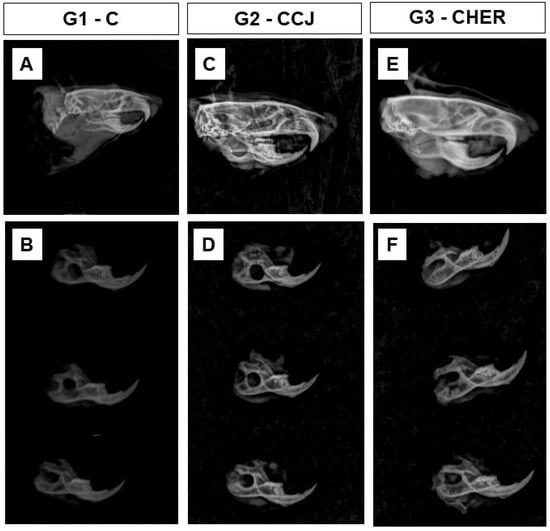 Clinical analysis of the surgical area of the mandibular branch of the animals used in this study showed normal hair growth, as well as skin coloration and healing, six weeks after surgery. In addition, the operated areas were lined with integral local musculature and adhered well to the mandible, with no clinical signs of complications such as infections, purulent secretion, tissue necrosis, or any other signs that would also indicate clinical signs of rejection of the scaffolds used in G2 and G3 (Figure 7). Therefore, the protocol used in the surgical procedure was within the expected standards as described in the experimental literature on mandibular regeneration [].