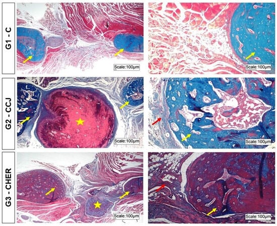 Histological images of the bone lesions in the branches of the mandibles of rats in groups G1 to G3 stained with Masson’s trichrome. Note the bone neoformation (yellow arrows) from the edges of the bone lesion and remnants of the scaffolds (star) implanted in G2 and G3. Reactive connective tissue (red arrows).