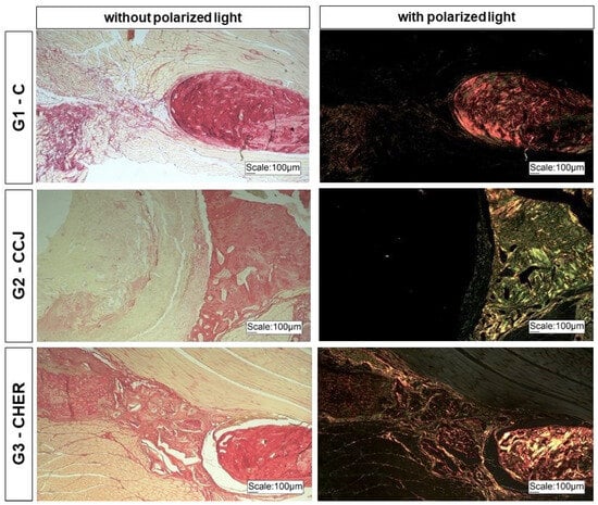 Photomicrographs of the bone lesions in the branches of the mandibles of rats in groups G1 to G3 stained with Picrosirius red in the absence and presence of polarized light. Note the birefringence of the tissues present in the bone lesion.